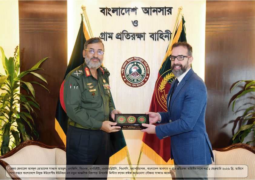 মহাপরিচালক, বাংলাদেশ আনসার ও গ্রাম প্রতিরক্ষা বাহিনীর সাথে গত ১ ফেব্রুয়ারি ২০২৬ খ্রি. তারিখে সদর দপ্তরে বাংলাদেশে নিযুক্ত ইউরোপীয় ইউনিয়ন এর নতুন আঞ্চলিক নিরাপত্তা উপদেষ্টা মিস্টার রুবেন রুইজ ক্যাডনোসা সৌজন্য সাক্ষাত করেন।