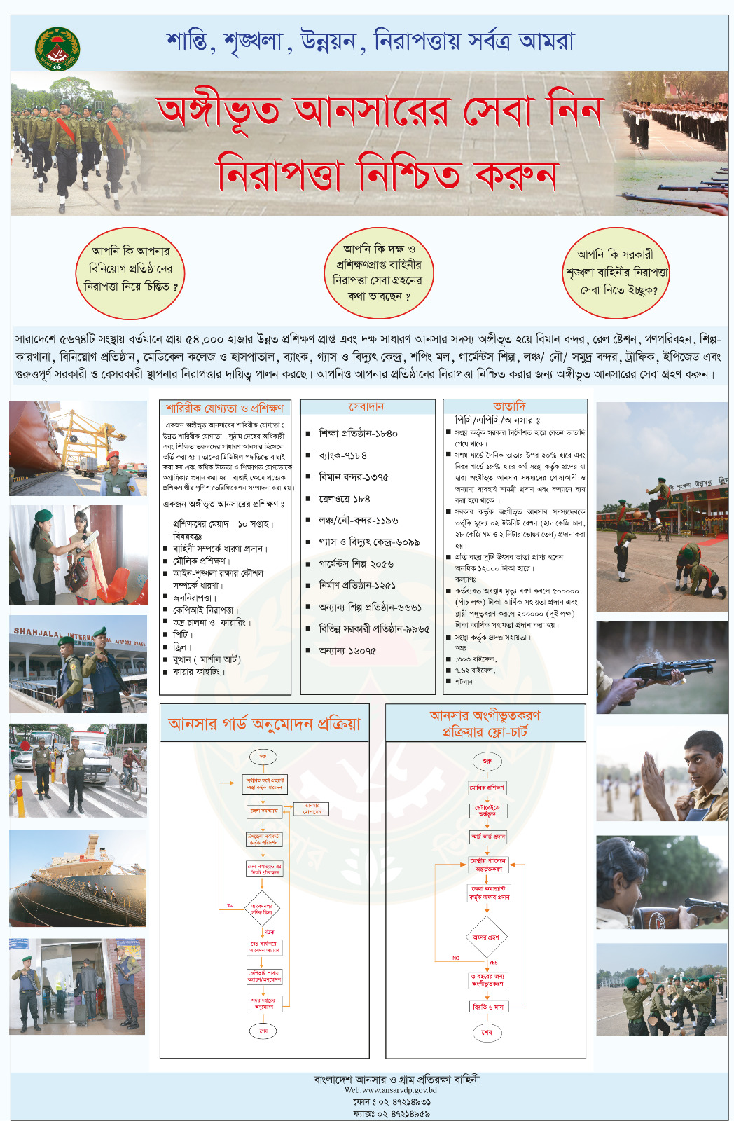 আপনার প্রতিষ্ঠানের নিরাপত্তার জন্য বাংলাদেশ আনসার বাহিনীর সেবা নিন। আনসার সদস্যদের রয়েছে নিরাপত্তা সেবা দেওয়ার উপযুক্ত অস্ত্র ও মার্শাল আর্টে উন্নতর প্রশিক্ষণ ও শৃংখলা বোধ।